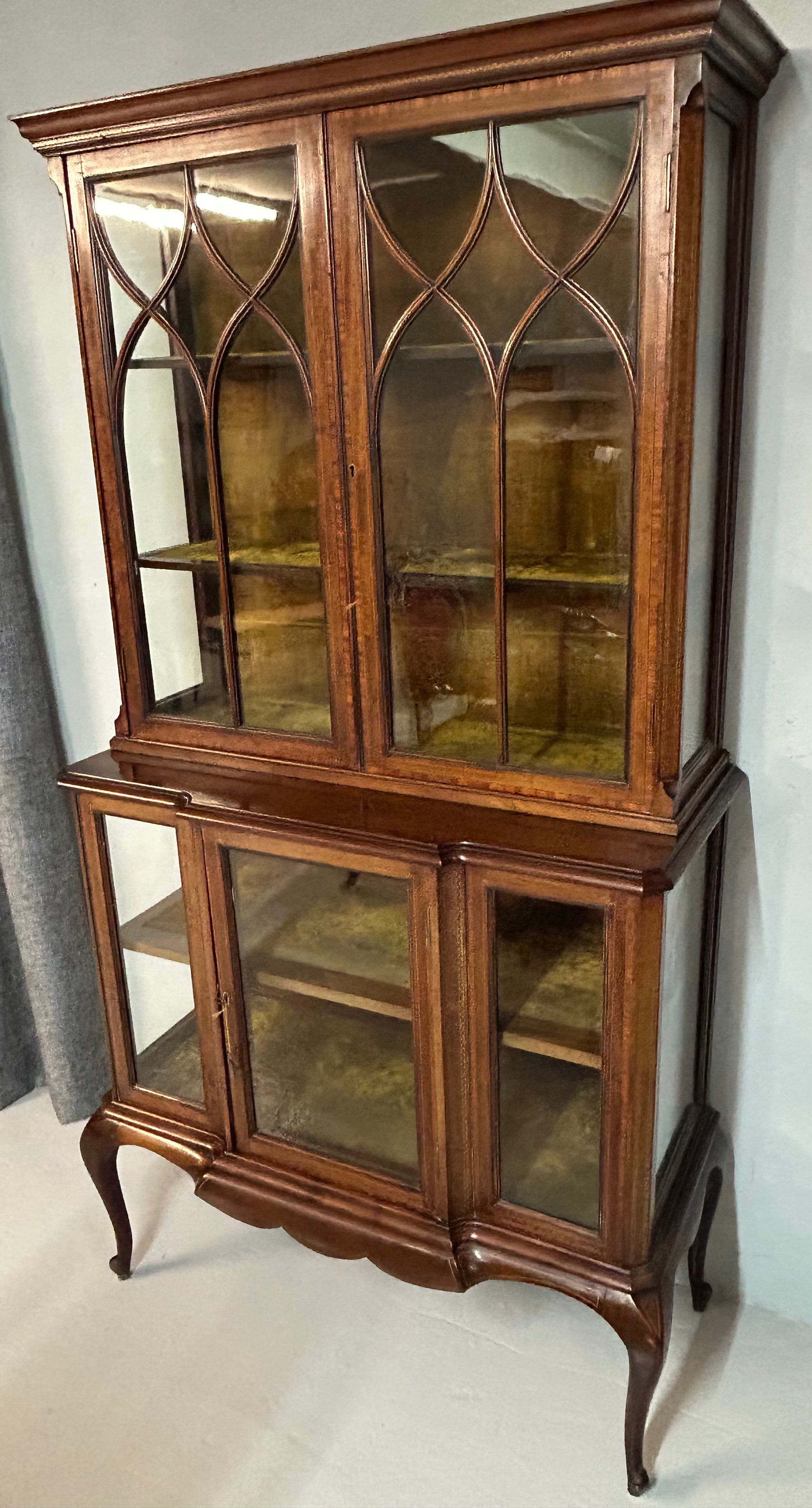 This Edwardian inlaid display cabinet, crafted from mahogany with cross-banded design and string inlays, offers both aesthetic appeal and functionality. Its two-piece construction facilitates easy transportation to properties with limited access. The original velvet lining enhances the presentation of displayed objects while providing protection against scratches. All round condition is very good considering its age with only a small amount of slight damage to top door beading (please see photo). Each compartment has a brass lock with key.