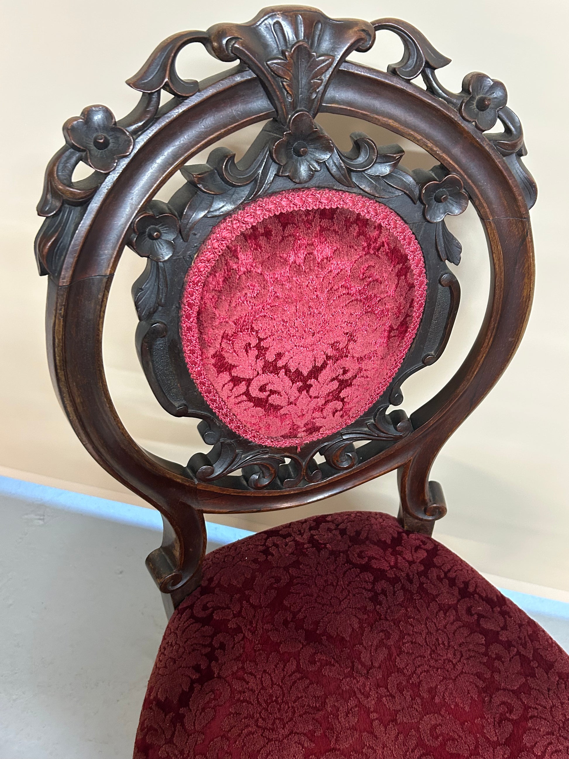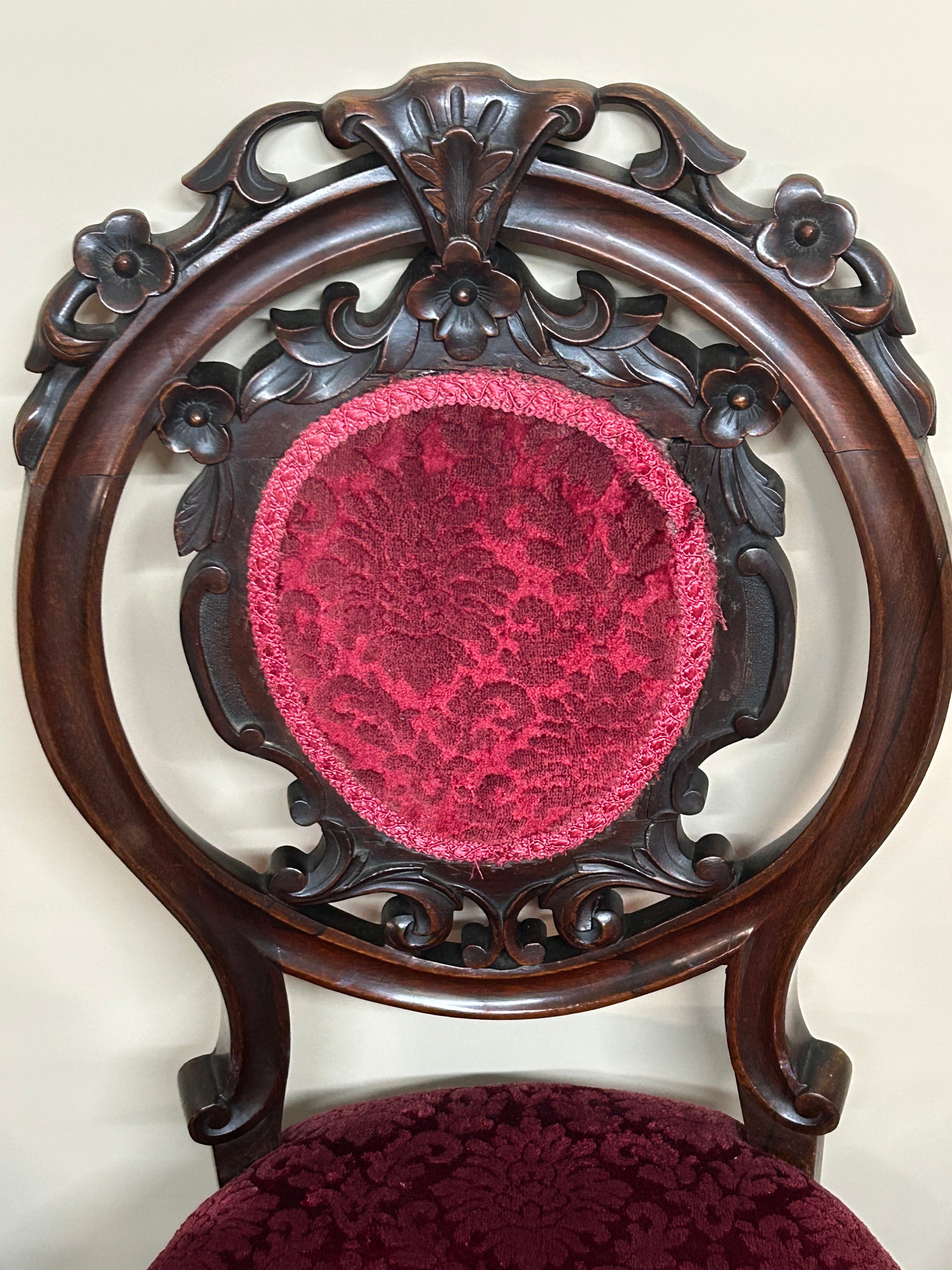 Enhance your dining room with this set of 6 Victorian rosewood dining chairs. Crafted from solid rosewood, these chairs feature intricate detailed carvings and replaced (not sure when) crushed velvet embossed upholstery. Perfect for adding a touch of elegance to any dining space. Chairs are in good condition considering the age and are ready to be used. Overall dimensions are 95cm height x 53cm depth x 49cm width. Seat height is 48cm. Chairs can be collected in store from LL29 or please contact seller for possible delivery quote.